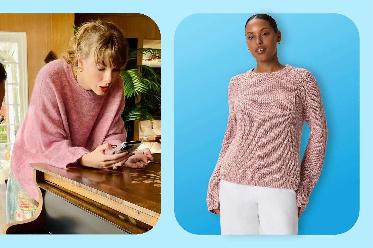 Swift posted an Instagram carousel earlier this month showcasing behind-the-scenes photos of the songwriting process with Max Martin and Shellback. One thing stood out in the studio-based pics — Swift’s cozy pink crewneck sweaterwhich she’s wearing while leaning against a wooden piano.