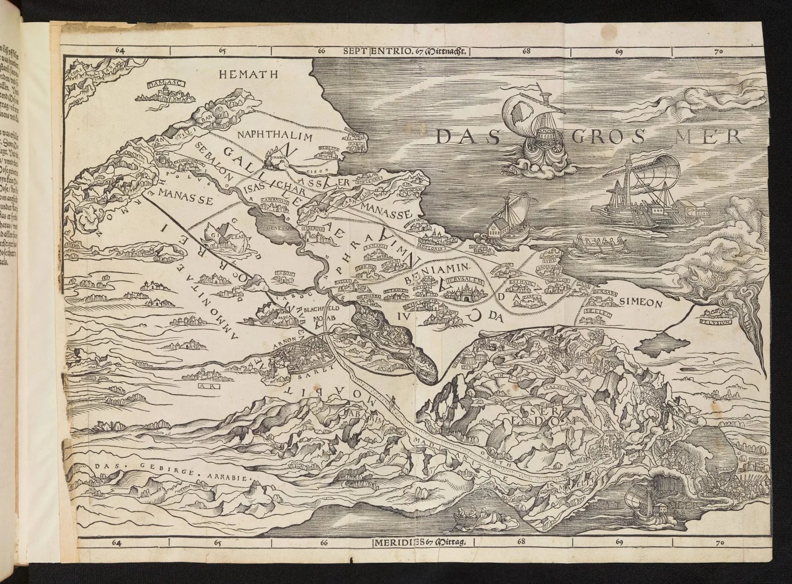 Inside this volume, Cranach’s map illustrates both the key locations associated with the wilderness wanderings and the division of the Promised Land into twelve tribal regions. These borders reflected a specifically Christian interest in asserting a historical claim to the sacred sites connected to the Old and New Testaments.