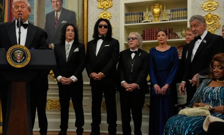 Songs by honorees Gaynor and Kiss played in the Rose Garden just outside the Oval Office as members of the White House press corps waited nearby for Mr. Trump to begin the ceremony.