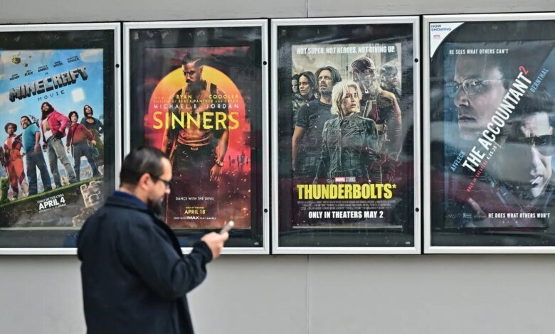 A man walks past movie posters at at AMC Theater in Montebello, California on May 5, 2025.