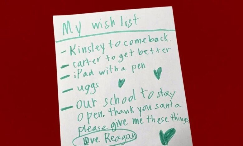 Scribbled in green marker, Reagan’s list already began with selfless requests: for her best friend to move back and a classmate to recover from a broken wrist. Then, the usuals: an iPad and boots.