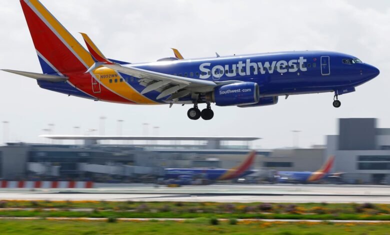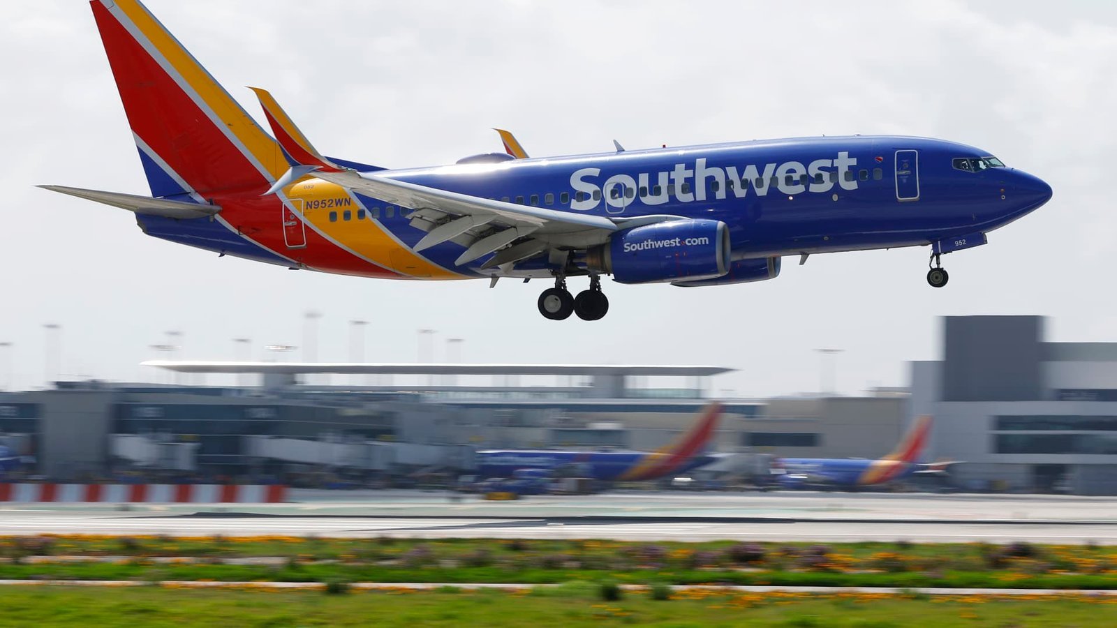 A Southwest Airlines Boeing 737 airplane arrives at Los Angeles International Airport from San Francisco on March 28, 2025 in Los Angeles, California.