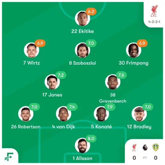Jeremie Frimpong was Liverpool’s best player in the 0-0 draw at home to Leedsbut six individuals averaged less than a six-out-of-10 rating.