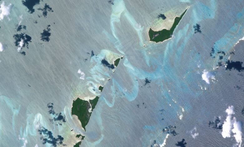 This photo shows a series of intricate sandbanks and a shallow barrier-like coral reef in the waters surrounding two diminutive islands — Carter’s Cays (lower left) and Strangers Cay (upper right). The islands are two of the northernmost landmasses in the Bahamas, located around 125 miles (200 kilometers) east of Florida. (For context, Strangers Cay is around 2.2 miles (3.6 km) across at its widest point.)
